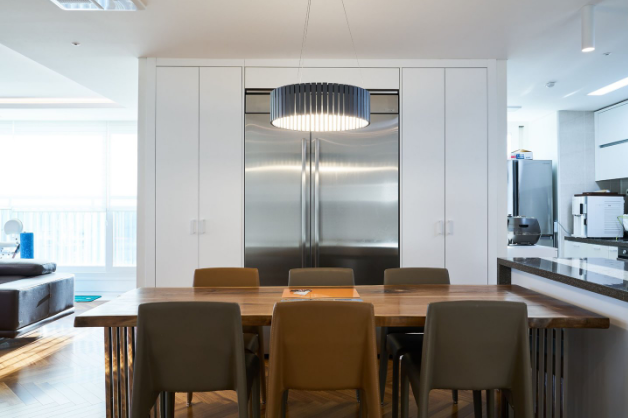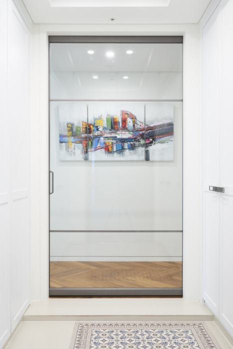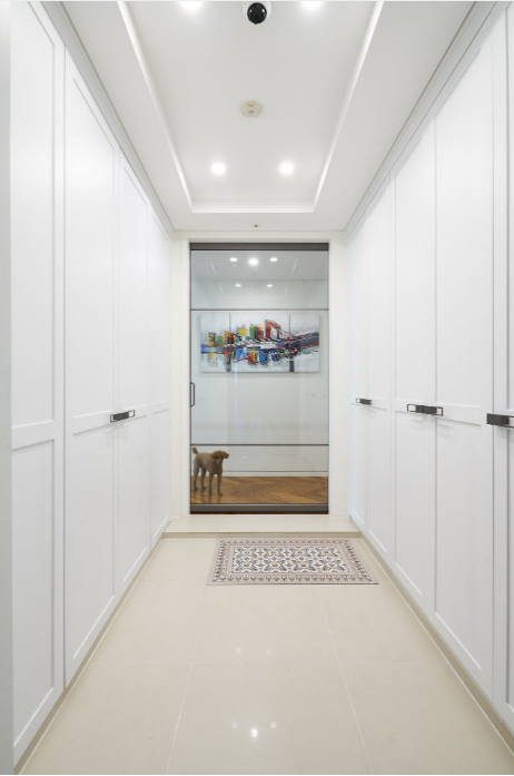 좌우공간이 넓은 현관은 양쪽으로 화이트색상의 신발장을 제작하고 맞은편 복도 벽면 중심에 액자를 걸어 갤러리 느낌을 주기위해 그림을 해치지 않도록 프레임이 얇은 알루미늄 슬라이딩 도어를 사용하여 개방감을 주었습니다.
