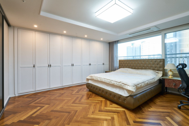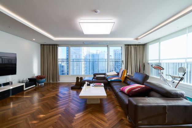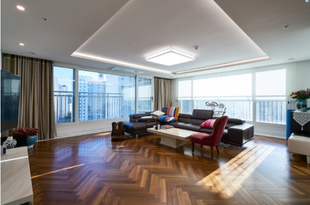 참고로 원목마루의 단점이 관리가 어렵고 습기에 약하다는게 있죠. 그래서 분양부터 확장되어 있는 아파트 같은경우 좀 꺼려하시기도 하는데요. 약간의 팁을 드리면 창호 하단부위를 타일로 마감하면 만약 비가 약간 들이치더라도 마루에는 전혀 문제없이 오래 쓰실 수 있습니다.