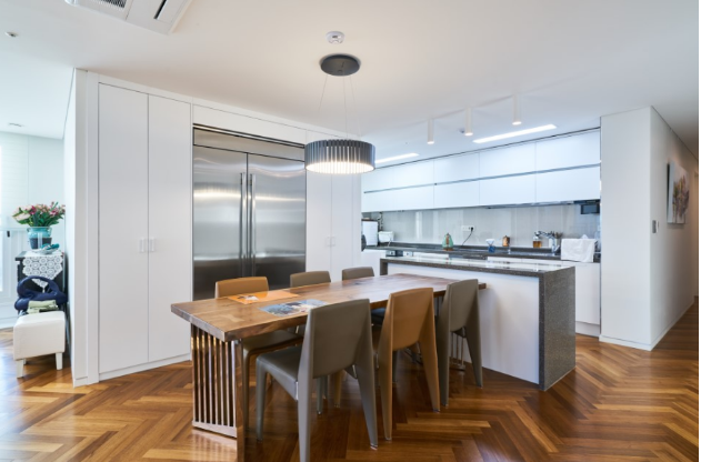 화이트 벽과 고급스러운 헤링본의 만나 갤러리 같은 공간