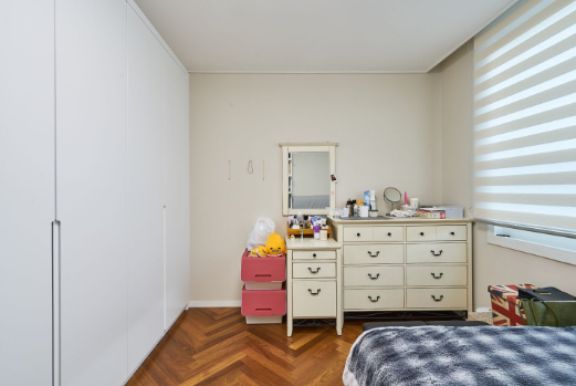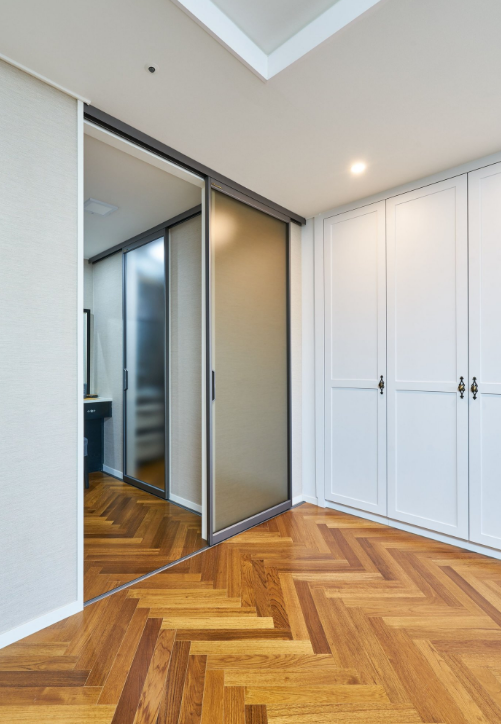 기존엔 파우더룸 없이 길게 붙박이장으로만 구성되어 있던 공간이였으나, 파우더룸과+드레스룸이 필요하셨기에 붙박이장 일부분은 다른공간으로 이동시공을 해드리고 목공작업을 통해 공간을 구성해 드렸습니다. 보기보다 좁은 공간이기에 문은 슬라이드로 만들어 공간소모를 최소화 시켰습니다.
