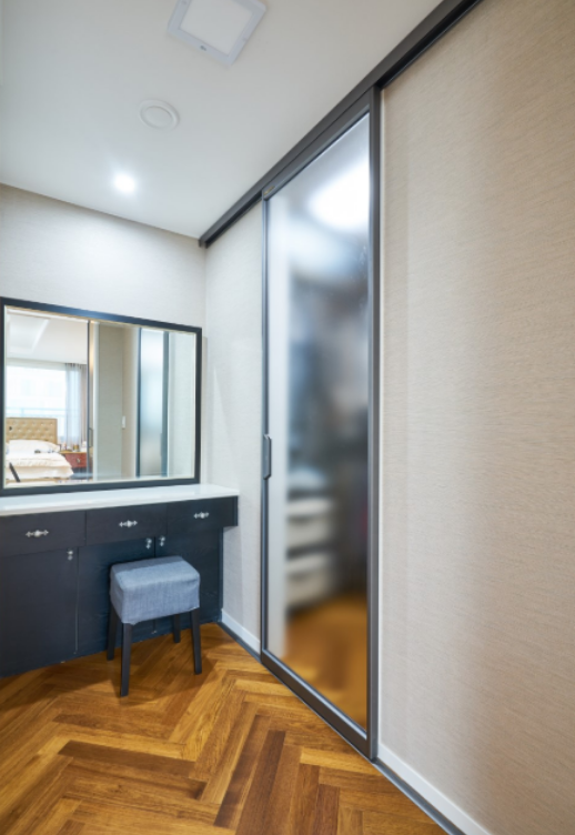 기존 화장대의 사이즈를 확인해서 만들어 드린 안쪽에 파우더룸+드레스룸 역시 여기도 공간은 최소화 하기위해 문은 슬라이드로 하였습니다.