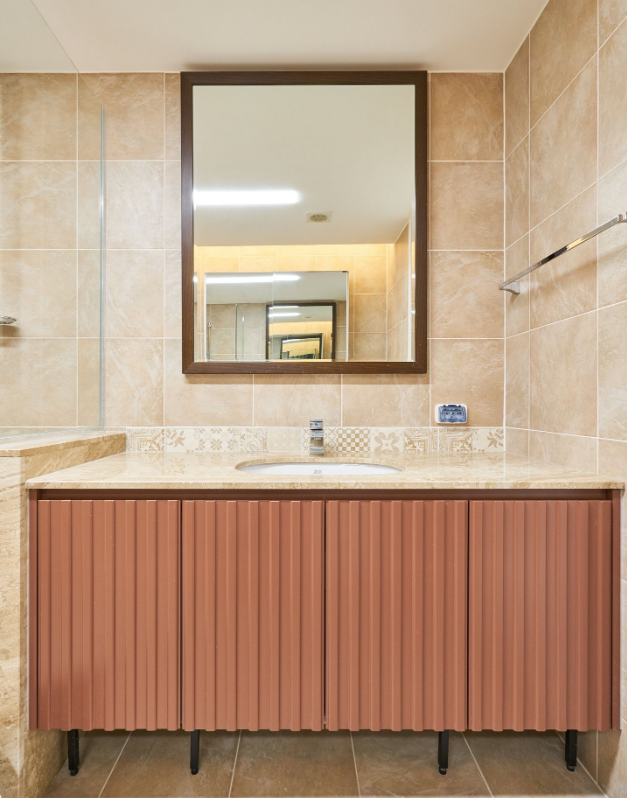 마지막으로 짚어드릴 부분은 여닫이문으로 가운데 문이 있고 좌측엔 변기가 우측엔 세면대가 있던 화장실인데요. 이러다 보니 문을 열면 변기 또는 세면대를 가리게 되어 그 넓은 공간에 하부장 없이 세면대만 있어 오히려 남는 공간에 대한 활용도가 너무 없었던 부분이 있었습니다. 해결책으로 문을 슬라이드로 바꾸면서 하부장+수납공간 두 가지를 모두 구성할 수 있게 되었습니다.