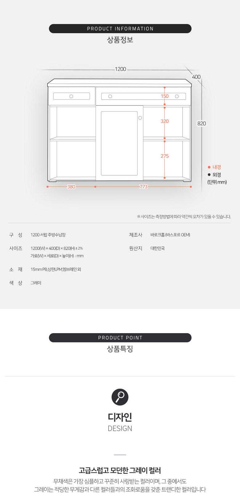 바로크홈 이브 그레이 1200 서랍 주방수납장