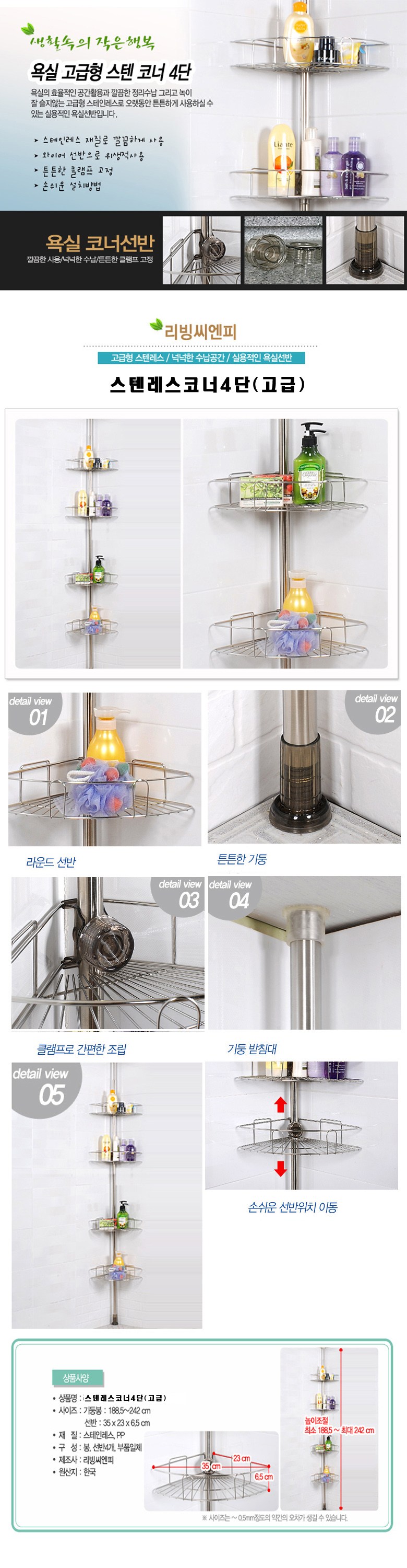 리빙씨엔피 욕실 고급형 스텐레스 코너 선반4단
